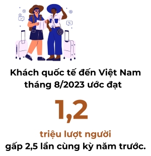 Đáng chú ý, hoạt động du lịch tăng trưởng mạnh mẽ nhờ đẩy mạnh công tác xúc tiến, quảng bá sản phẩm nhằm thu hút khách du lịch, đặc biệt là khách quốc tế. Số liệu từ Tổng cục Thống kê, khách quốc tế đến Việt Nam tháng 8/2023 ước đạt 1,2 triệu lượt người, gấp 2,5 lần cùng kỳ năm trước; tính chung 8 tháng năm 2023, khách quốc tế đến nước ta ước đạt hơn 7,8 triệu lượt người, gấp 5,4 lần. Đây tiếp tục là chất xúc tác chính cho tăng trưởng doanh thu từ dịch vụ du lịch và dịch vụ lưu trú và ăn uống vào tháng 8.