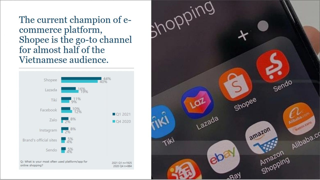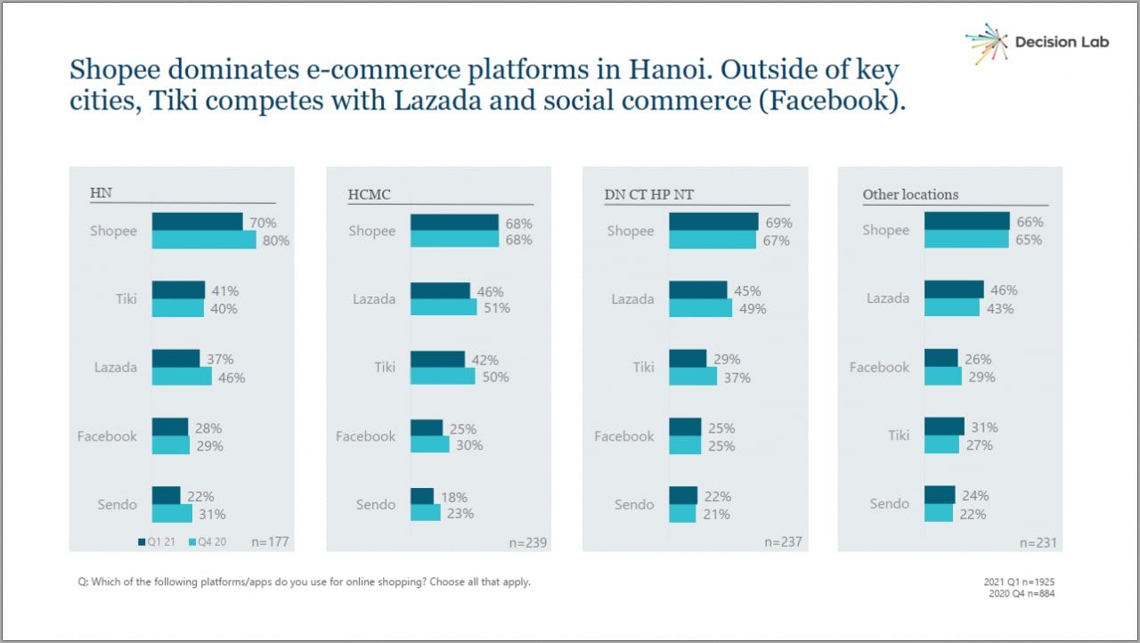 Tại Việt Nam, Shopee vẫn là nền tảng được ưa chuộng nhất tại hai thành phố trọng điểm (TP.HCM và Hà Nội). Tuy nhiên, các công ty khởi nghiệp nhỏ có mô hình phân phối chi phí thấp dựa vào các nền tảng mạng xã hội trên khắp các khu vực đang được chú ý đầu tư.