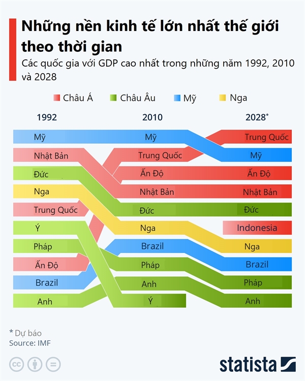 Theo dữ liệu từ IMF, 4 trong số 6 quốc gia hàng đầu trên thế giới tính theo quy mô tổng sản phẩm quốc nội (GDP) theo đồng giá sức mua (PPP) vào năm 2028 sẽ nằm ở châu Á. Điều này đồng nghĩa các nền kinh tế ở châu Âu bị đẩy xuống thứ hạng thấp hơn.