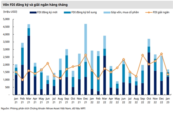 Trong tháng 1/2023, vốn FDI giải ngân giảm 16,3% so với cùng kỳ xuống còn 1,35 tỉ USD. Tổng vốn FDI đăng ký giảm 19,8% so với cùng kỳ xuống mức 1,69 tỉ USD do vốn đăng ký bổ sung và góp vốn mua cổ phần đều giảm so với cùng kỳ năm trước.