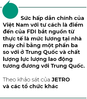 Theo khảo sát của JETRO và các tổ chức khác, sức hấp dẫn chính của Việt Nam với tư cách là điểm đến của FDI bắt nguồn từ thực tế là mức lương tại nhà máy chỉ bằng một phần ba so với ở Trung Quốc và chất lượng lực lượng lao động tương đương với Trung Quốc.