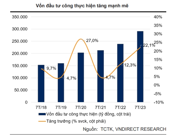 “Vì vậy, chúng tôi giữ nguyên dự báo vốn nhà nước thực hiện năm 2023 tăng trưởng 25% so với số thực hiện thực tế trong năm 2022”, VNDirect đánh giá.
