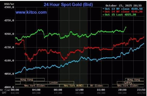 Chốt phiên giao dịch 15/10, giá vàng thế giới giao ngay tăng 66 USD lên 4.207 USD một ounce. Sang phiên sáng 16/10, thị trường tiếp tục đi lên, hiện chạm 4.225 USD. Đây là mức kỷ lục mới của kim loại quý.