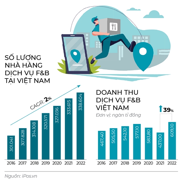 Đáng chú ý, thị trường giao đồ ăn tại Việt Nam năm 2022 cũng tăng trưởng gấp 3 lần so với trước khi dịch bệnh bùng phát, ở mức gần 30.000 tỉ đồng. Theo kết quả nghiên cứu ngành thương mại điện tử trong lĩnh vực thực phẩm, đồ uống, có khoảng 12,23 triệu người đặt giao đồ ăn qua các nền tảng trực tuyến và tốc độ tăng trưởng số lượng người dùng hằng năm là 17,5%, tương đương với 1,8 triệu người.