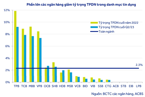 Mặc dù Thông tư 03/2023/TT-NHNN cho phép các ngân hàng mua lại trái phiếu doanh nghiệp đến hết ngày 31/12/2023 để thực hiện các cam kết (nếu có) đối với các trái phiếu đã bán ra trước đó, Công ty Chứng khoán ACB (ACBS) cho biết họ nhận thấy hầu hết các ngân hàng đã giảm tỉ trọng trái phiếu doanh nghiệp trong bối cảnh rủi ro tín dụng của nhà phát hành vẫn đang ở mức cao.
