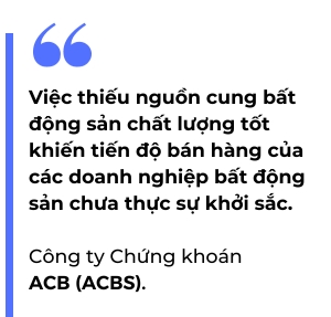 Ngoài ra, ACBS cho rằng việc thiếu nguồn cung bất động sản chất lượng tốt khiến tiến độ bán hàng của các doanh nghiệp bất động sản chưa thực sự khởi sắc, mặc dù lãi suất cho vay mua nhà hiện đã giảm 2-3% so với thời điểm cuối năm 2022. Dòng tiền do đó vẫn còn đang bị tắc nghẽn trong khu vực dân cư và bài toán thanh khoản doanh nghiệp bất động sản vẫn chưa được giải quyết triệt để. Chính phủ và cơ quan nhà nước đã có những giải pháp tháo gỡ vướng mắc pháp lý cho các dự án bất động sản, điều này sẽ tạo điều kiện cho các doanh nghiệp bất động sản huy động nguồn vốn vay ngân hàng và mở bán dự án trong tương lai. Mặc dù ACBS cho rằng quá trình này sẽ còn mất nhiều thời gian để giúp khai thông thị trường bất động sản.