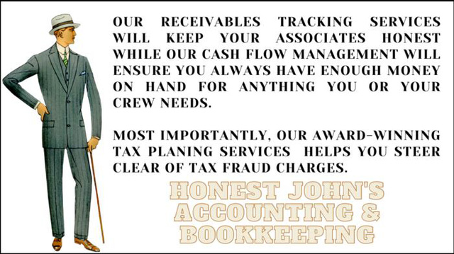Quảng cáo này chỉ nêu bật lợi ích: Honest John’s Accounting & Bookkeeping – Giúp cho các đồng nghiệp luôn trung thực – Luôn có đủ tiền mặt để làm chủ dòng tiền – Tránh các cáo buộc gian lận thuế.