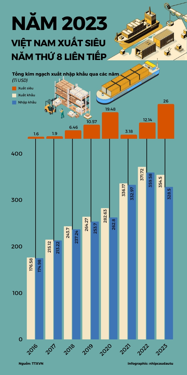 Năm 2023, cán cân thương mại cả nước tiếp tục xuất siêu năm thứ 8 liên tiếp với thặng dư ước đạt 26 tỉ USD, tăng gần gấp 3 lần năm 2022.