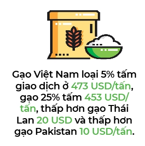 Hiện gạo Việt Nam loại 5% tấm giao dịch ở 473 USD/tấn, gạo 25% tấm 453 USD/tấn. Đây là mức giá cao nhất trong vài năm qua. Tuy nhiên, mức giá này hiện vẫn thấp hơn gạo Thái Lan 20 USD và thấp hơn gạo Pakistan 10 USD/tấn.